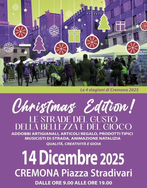 Appuntamento per domenica 14 dicembre con il Mercatino "Le Strade del gusto e della bellezza Christmas Edition". La manifestazione si inserisce nel calendario degli eventi “Le 4 stagioni di Cremona” e nel calendario degli eventi dedicati al Natale della città di Cremona.
