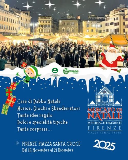 Chalet in legno in piazza Santa Croce. Insolito? Sì, ma non a Natale, quando in una delle piazze più suggestive del centro di Firenze, da oltre vent'anni, prendono vita i Mercatini di Natale, mentre la Basilica di Santa Croce apre i battenti a momenti di raccoglimento. Gli oltre cinquanta stand ospitati nelle caratteristiche casette di legno, porteranno a Firenze i profumi e i sapori tipici del Natale con prodotti di artigianato artistico e cibi tradizionali provenienti da tutta Europa con oggetti per il presepe e addobbi natalizi, idee-regalo e tentazioni gastronomiche.