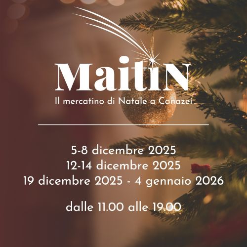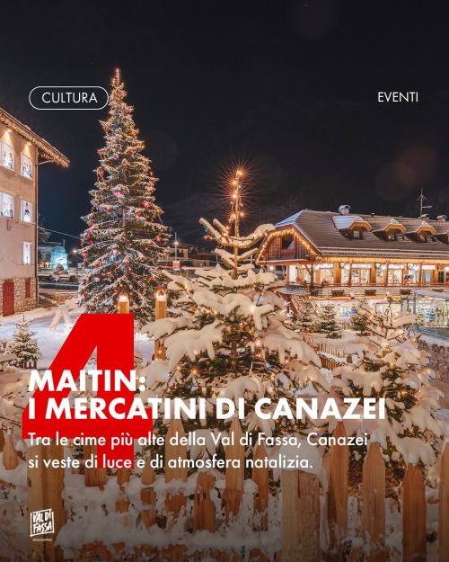Anche a Canazei quest'anno si svolgono i Mercatini di Natale: Maitin il Mercatino di Natale che viene allesrito all'interno del Parco cittadino, a pochi passi dal centro. Maitin è la parola ladina che indica la Messa della notte di Natale, quel momento in cui i bambini attendono con trepidazione l'arrivo di Gesù Bambino e dei suoi doni. Il Mercatino vuole essere un luogo dove i profumi di vin brulè e dei dolci tipici si mescolano ai sorrisi della gente, che si scalda accanto ai bracieri accesi. Qui puoi trovare idee regalo, prodotti realizzati a mano e le bontà della tradizione locale. Previsti concerti e attività per grandi e piccini, giochi in legno, musica e tante luci per animare questo Mercatino nel cyuore delle Dolomiti.